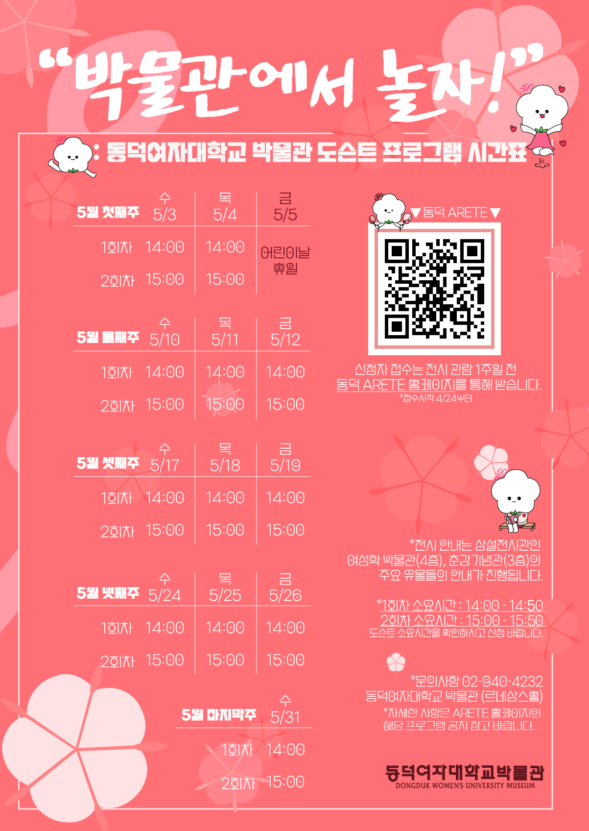 동덕여자대학교 박물관 2023 도슨트 프로그램 신청 안내 <오월, 박물관에서 놀자!> 2. 교육 기간 : 2023년 5월 3일~31일(매주 수, 목, 금) 3. 교육 내용 : 여성학박물관, 춘강기념관 전시 및 주요 유물 안내(약 50분 소요) 4. 교육 장소 : 동덕여자대학교 박물관(동덕 르네상스 홀) 5. 신청 방법 - ARETE 포트폴리오 신청 : ARETE 포트폴리오 접속 ▶ [비교과프로그램] ▶ [일반프로그램] ▶ 과정명 <박물관 2023 도슨트 프로그램 오월, 박물관에서 놀자!> ▶ 첨부파일 프로그램 신청서.hwp 작성 ▶ 신청서 첨부하여 신청 완료 - 1회 교육 인원(20명)으로 '승인' 여부 확인 필수 - 중복 수강 불가(ARETE 마일리지 1회 부여) - 수강 후 ARETE 만족도 조사 참여 필수 6. 프로그램 창여자 분들께 소정의 기념품을 증정합니다. 7. 문 의 : 박물관(02-940-4232/museum@dongduk.ac.kr) |