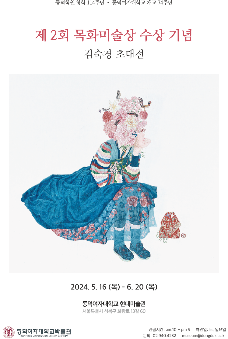 전시기간 : 2024년 5월 16일(목)~6월 20일(목) 전시장소 : 동덕여자대학교 박물관(동덕 르네상스홀) 2층 현대미술관 전시주관 : 동덕여자대학교 회화과 동문회, 동덕여자대학교 회화과, 동덕여자대학교 박물관 관람시간 : 10:00~17:00(점심시간 12:00~13:00, 16:00 입장 마감) * 토, 일요일 및 법정 공휴일 휴관 |